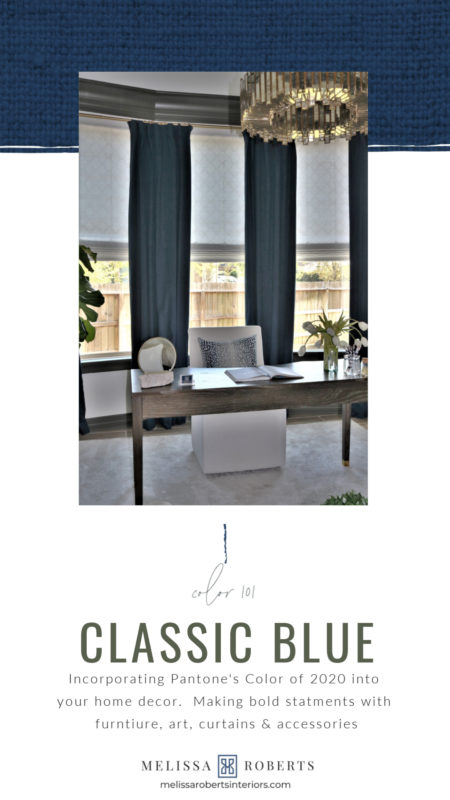 Curtains instantaneously transform any space. My office reveal is a perfect example. See the before picture, everything is the same as the reveal, except for the addition of the curtains. The curtains exude luxury while adding depth and texture. While these curtains are navy, not the Pantone color Classic Blue, navy is an excellent complimentary color that pairs great with Classic Blue.