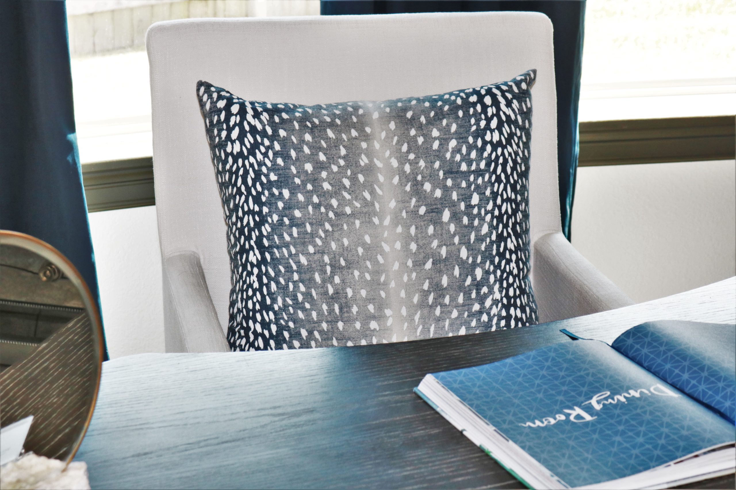 Curtains instantaneously transform any space. My office reveal is a perfect example. See the before picture, everything is the same as the reveal, except for the addition of the curtains. The curtains exude luxury while adding depth and texture. While these curtains are navy, not the Pantone color Classic Blue, navy is an excellent complimentary color that pairs great with Classic Blue.