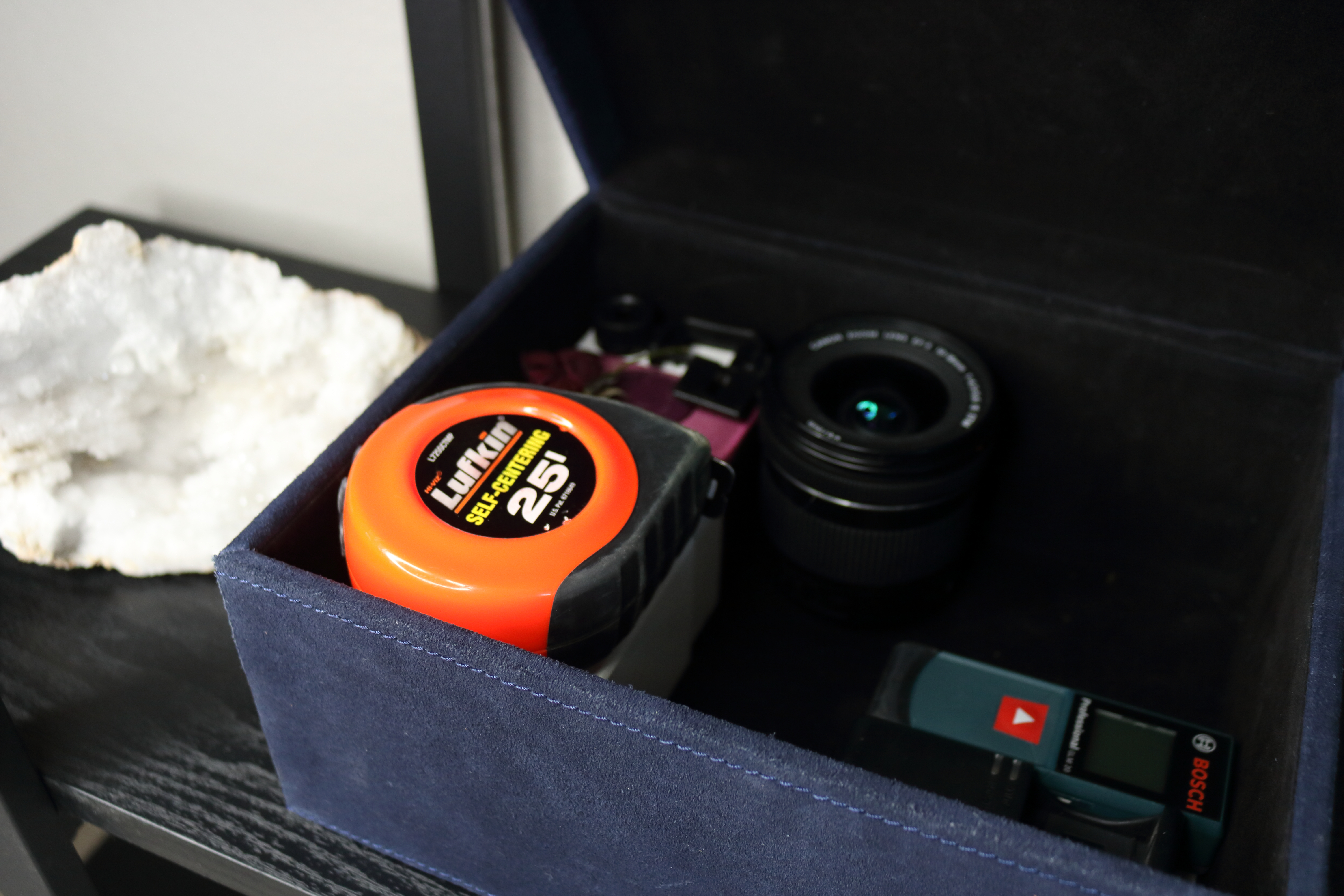 I love the modern, clean lines of this 5-tier storage bookcase. Most of the décor in this space is the work tools/material that I use on a daily, instead of storing it away I chose to showcase them in creative ways. Glass vases filled with tile and textile samples are a great display and accessible. I also keep the blue decorative boxes filled with essentials as well. And those adorable marble boxes, they hold more paperclips and office supplies. Get creative and see what kind of fun ways you can store your not so pretty must-haves.