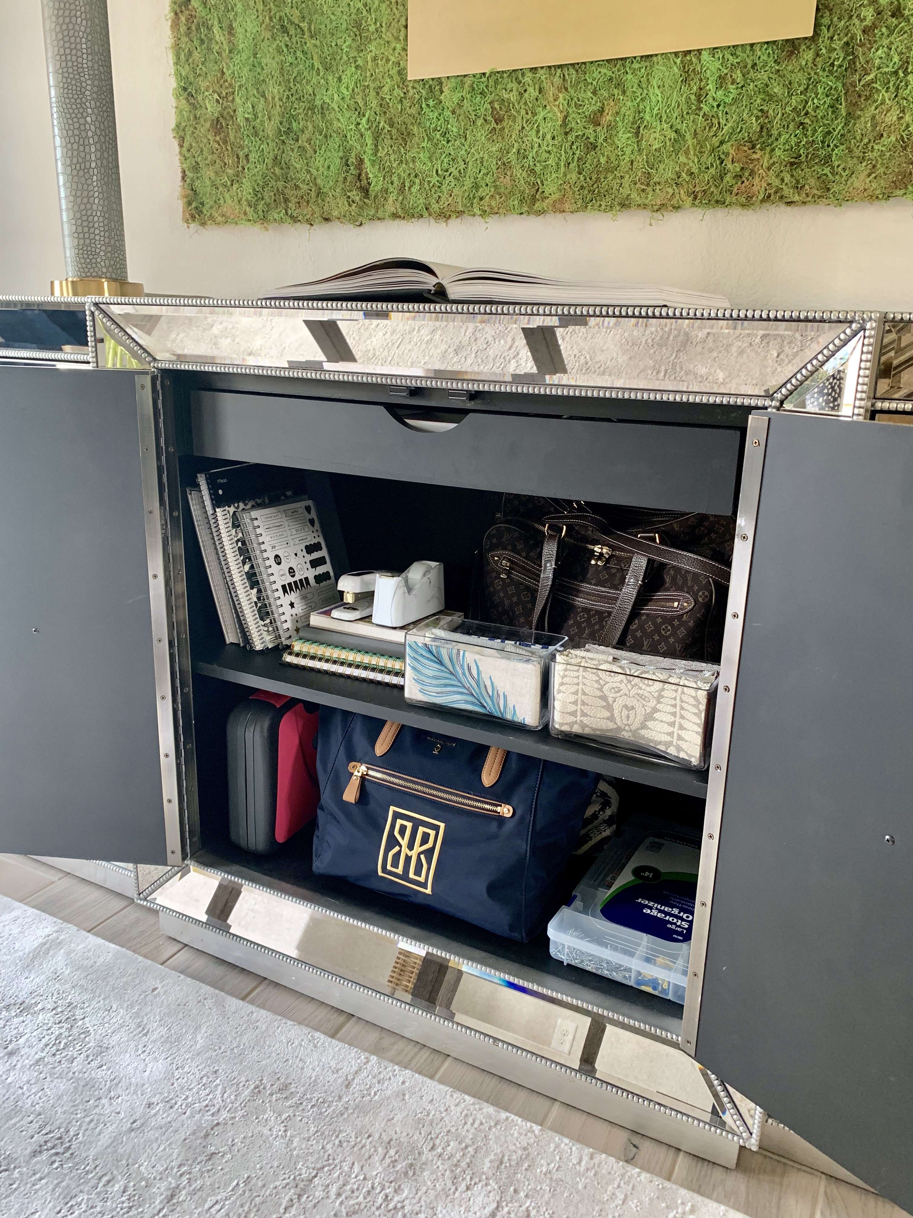 The mirror buffet brings in a level of glamour that this room required. It is also home for all those not so sightly office must-haves.