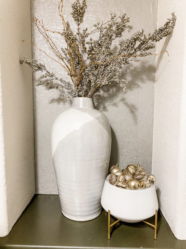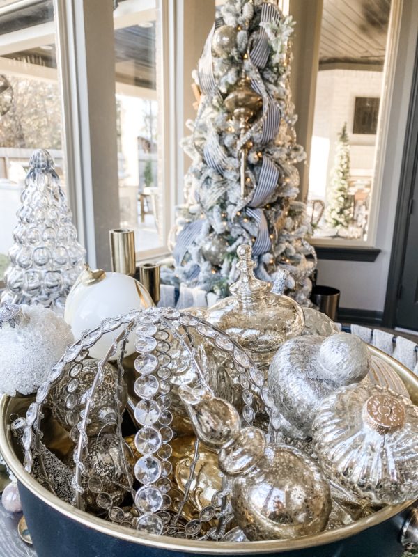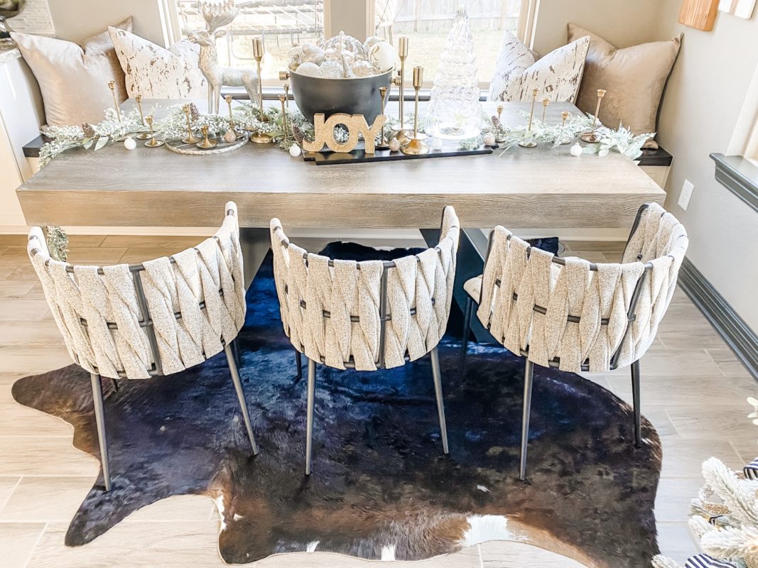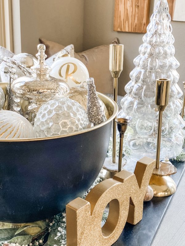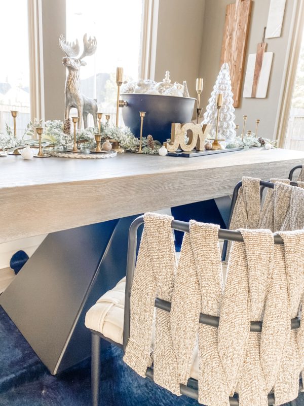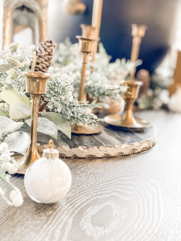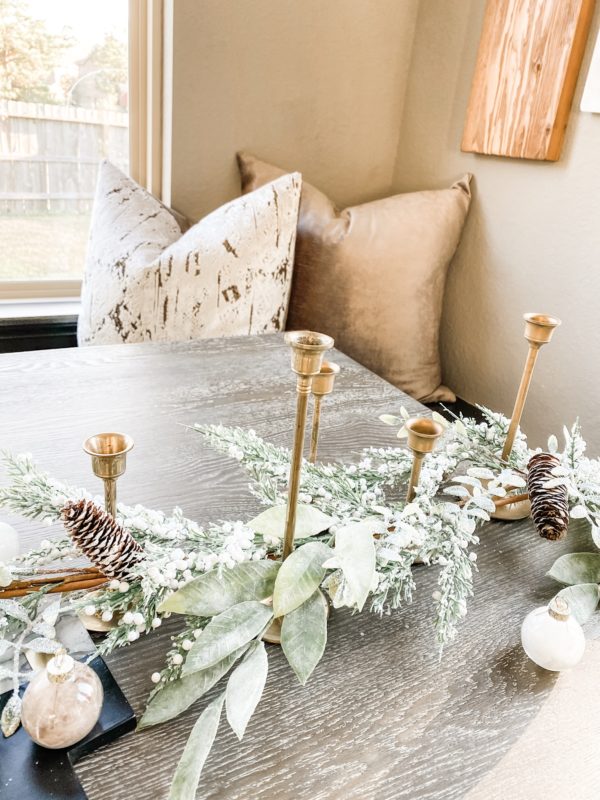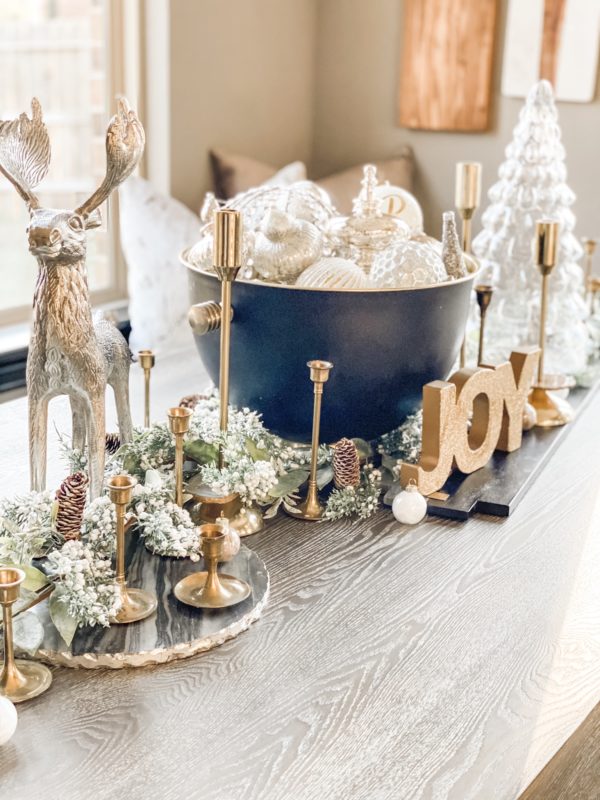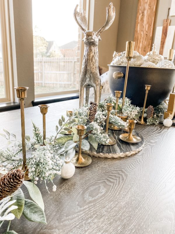Sometimes I have a design plan, stick to it, and execute to a T. Then, there are the outright design conundrums like this area has been. While shopping, I found a unique piece that I planned to use on the table, and I was enamored. It didn’t work, I tried, and I tried again. Trust me, when I say I tried and tried, with no avail of it working, I opted to switch directions. While there are a lot of layers added in, there is still a feeling of light and airiness in this nook. I used the same garland I added to my mantle and layered in brass candlesticks I found on FB Marketplace, ornament place holders, and a couple of cheese boards. To balance the table centrally, I used an old champagne bucket and stuffed it full of un-used ornaments.