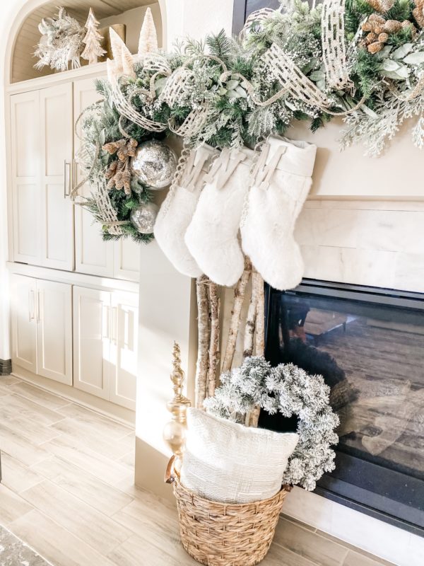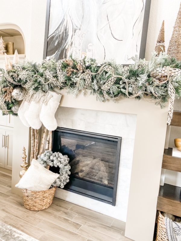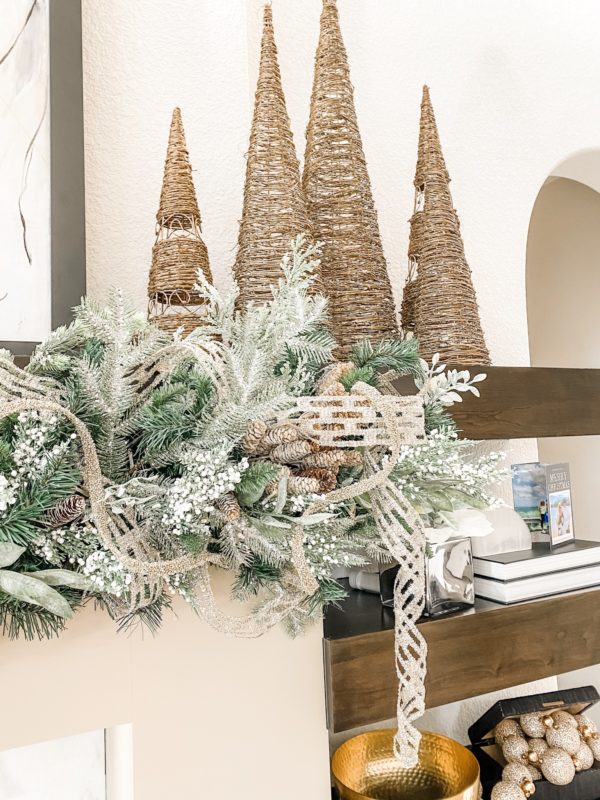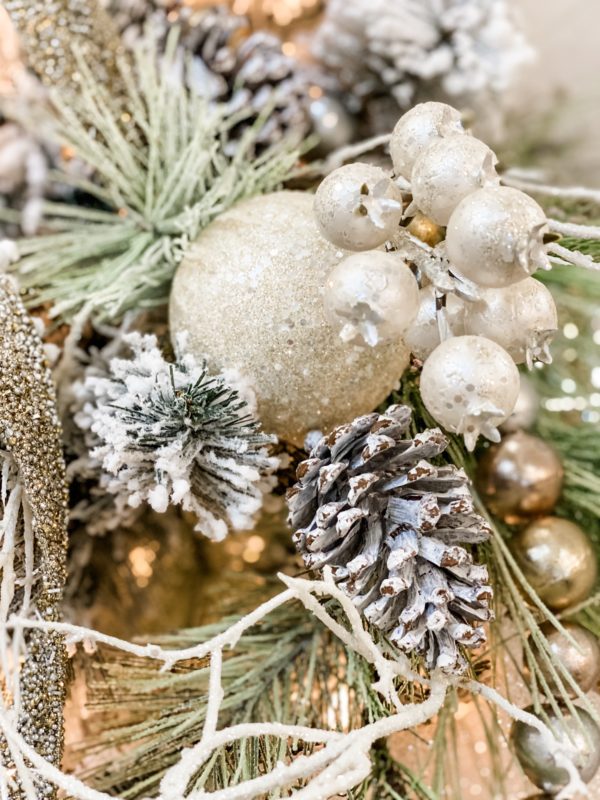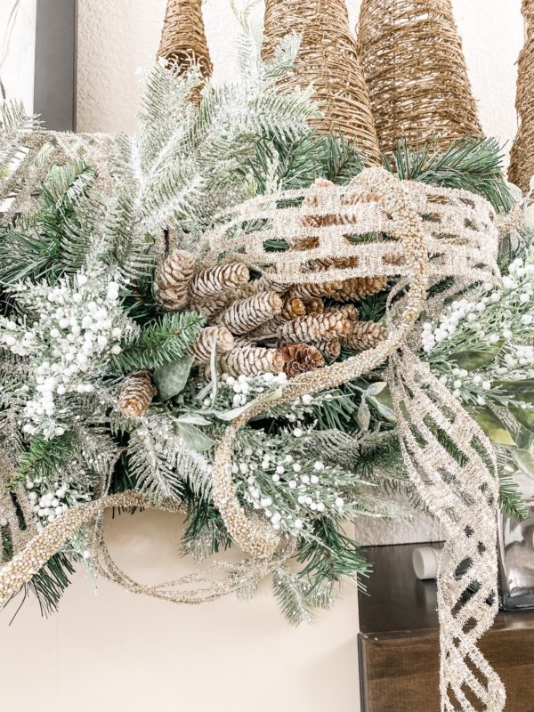 Pro Tip: Never underestimate the power of Christmas picks/stems and ribbon! I started the mantel with a standard 9′ pine garland, intertwined a thinner decorative garland (to see how to mix garlands click here), integrated picks and ribbon until I achieved this lush look!