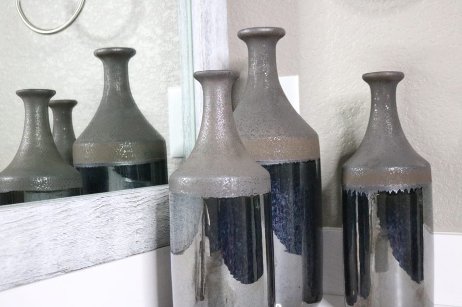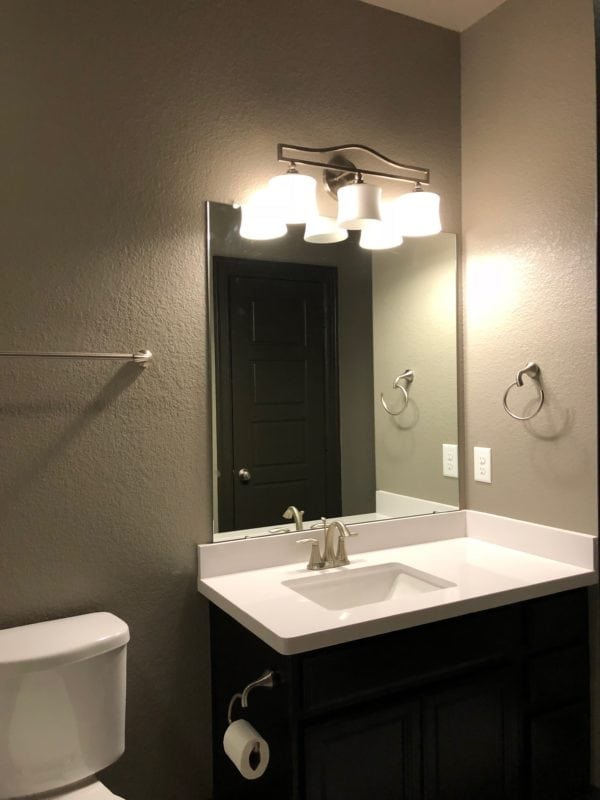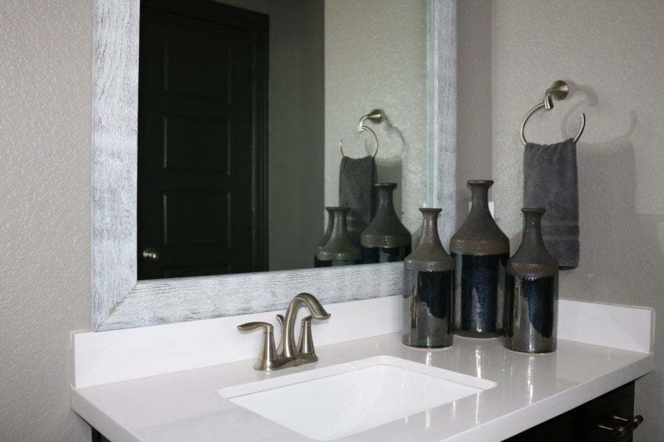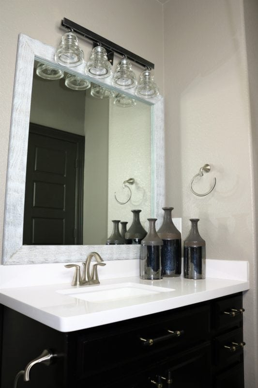 I plan to have the towel bars removed soon and replace them with something a bit more stylish. These plans are underway and will definitely be blogged once it’s complete. For now, I wanted to share the new cabinet hardware and the light fixture that helped bring this room to life. Of course this amazing frame attached to the old, existing mirror played a major role in this. Click here to read more about the frame!