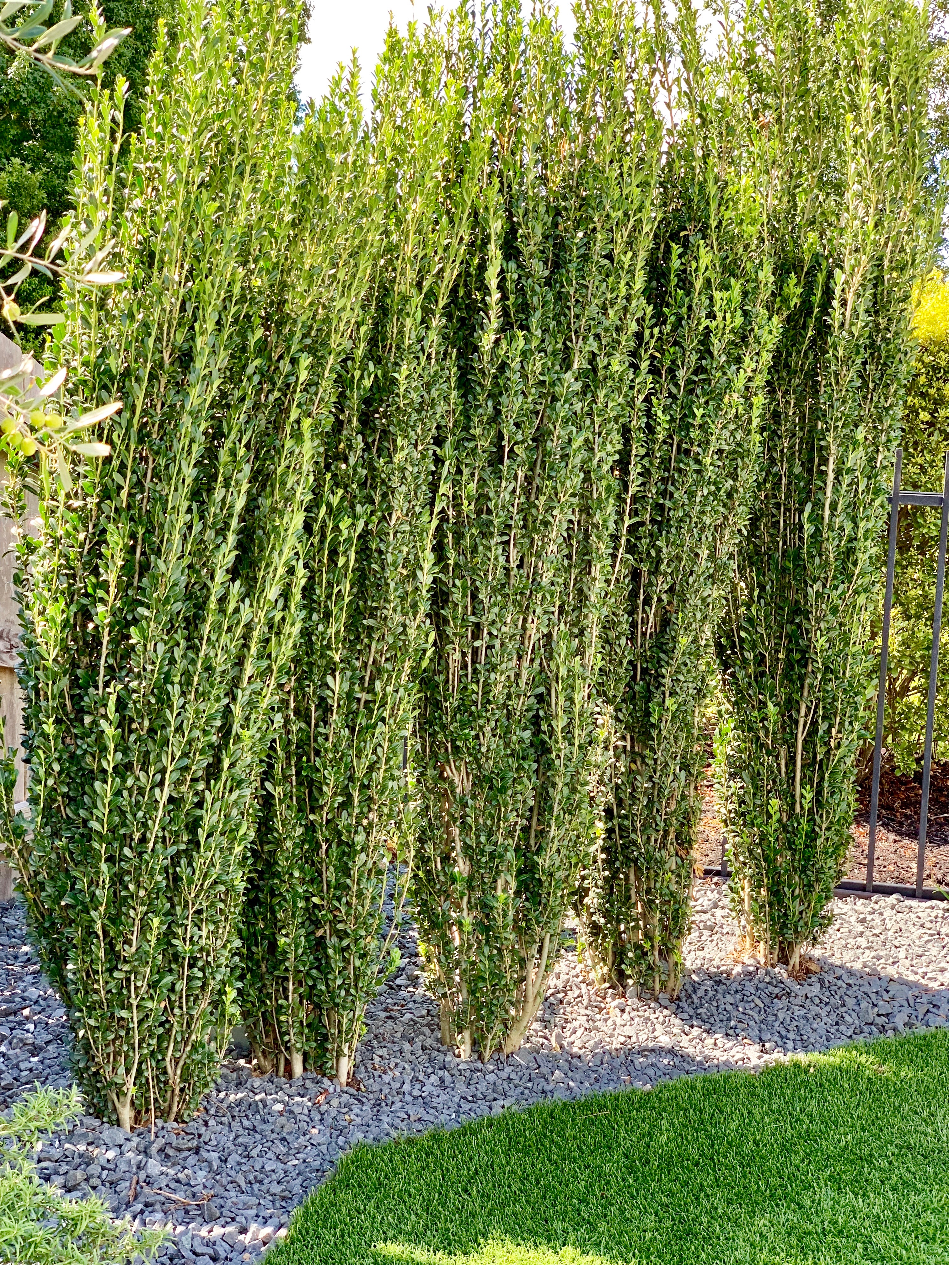 I have a green thumb, keeping plants alive and thriving is easy for me as long as I remember to water! When it was time to select plants for the backyard, I wanted easy maintainable and hard to kill plants. So naturally, I chose a faux wall: Jk, kind of. Having a pool means unsightly pool equipment. We don’t have a pool house to hide it in, so I had to get creative. I wanted something that would provide proper coverage year-round. At over 8’ tall this boxwood did just that.