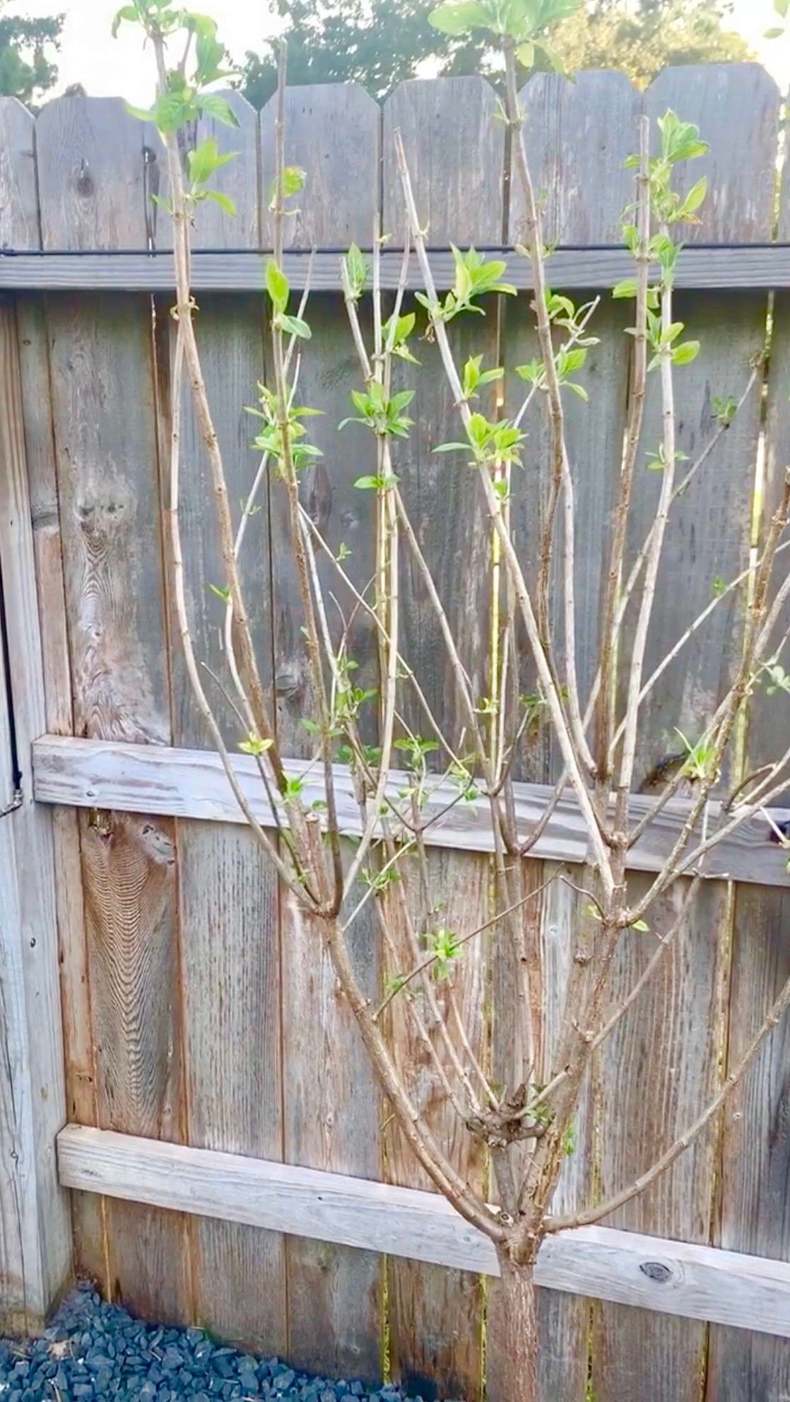 The fence is lined with vine-Jasmine. Once it grows, it will make a stunning manicured design.
