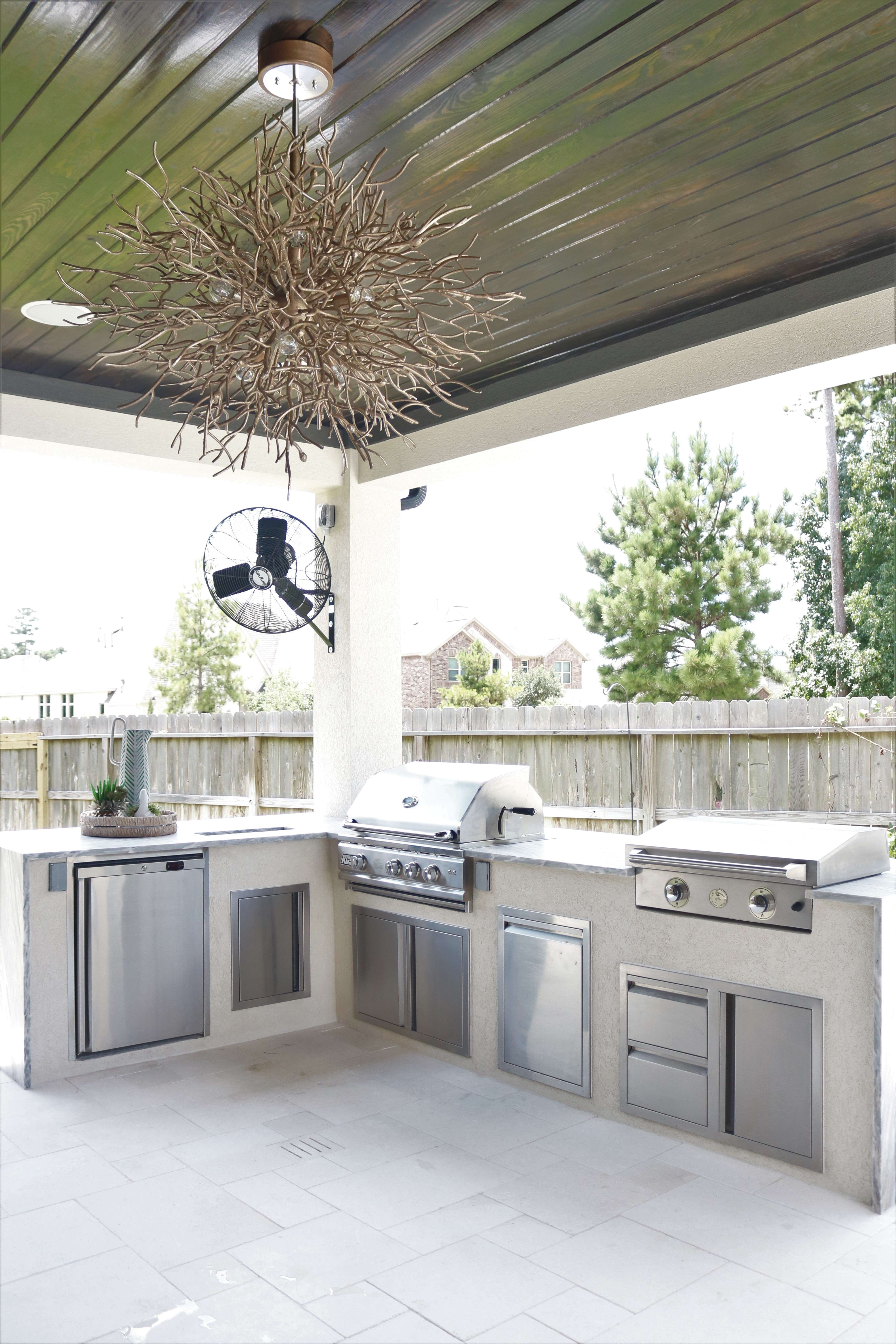 As far as appliances go, we kept it pretty simple, opting for a grill, griddle, and beverage fridge. The grill is a 32” with really fun L.E.D. lights. Big enough for everything we need, but not over the top. The griddle is 30” so plenty of room for my hibachi skills, still trying to perfect my volcano and choo-choo train show, stay tuned.
