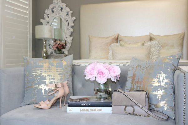 Think relaxing, calming, and peaceful. What colors did you think of? Bold colors don’t come to mind! This is important when planning your space. By no means does your room have to be all white but don’t use bright yellow or green. Add in colors such as a light blue, grey, or blush. Bringing in lots of layers and textures really helps the aesthetic. Your room will not be boring but it will be serene! I personally love designing a room with dark, moody colors. I recently did a master bedroom with charcoal walls, ceiling, trim, and doors. We hung chandelier sconces and black, velvet drapes. Doesn’t that sound enchanting? I will get around to blogging it one day. I keep our bedroom neutral but add in subtle color through the year, depending on the season. These peonies are fabulous and SO cheap! I highly recommend them!!