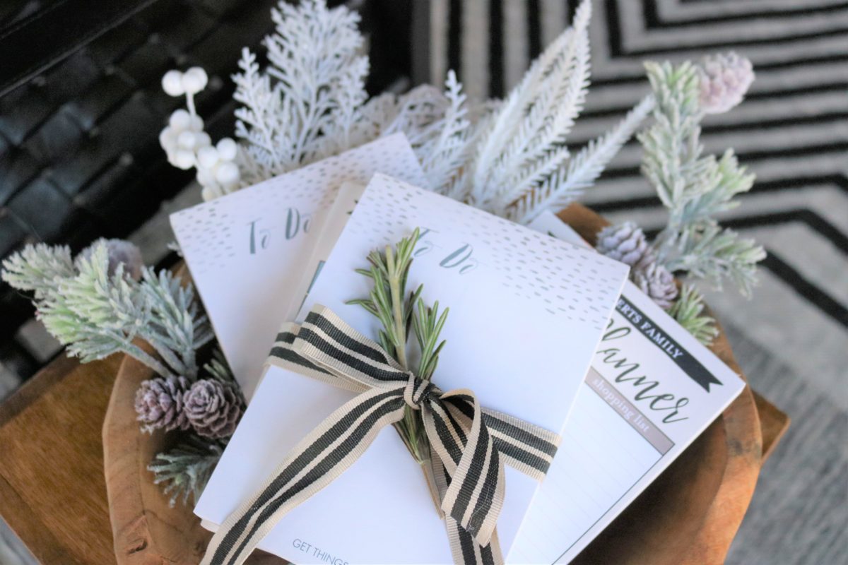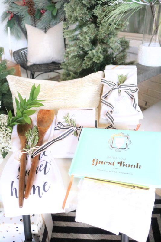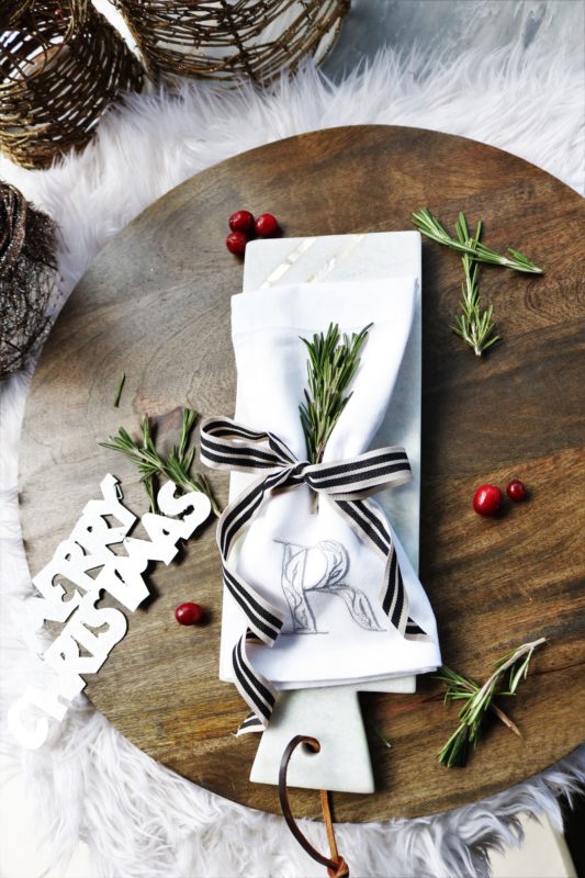 Last but certainly not least, it’s all about the presentation, right? Whether you are giving a bottle of wine, candle, or a vase full of the hostess’ favorite flowers, don’t forget to put the finishing touch making it unique by how you wrap it. It doesn’t have to be overly elaborate. While a gift basket may be my signature gift-giving style, this season, I have opted for a more organic approach using simple springs of rosemary and the classic black and white ribbon, classic and timeless. Don’t forget to add a little note to the host!